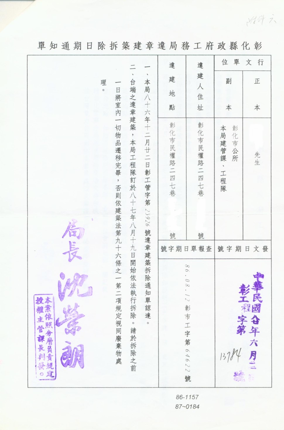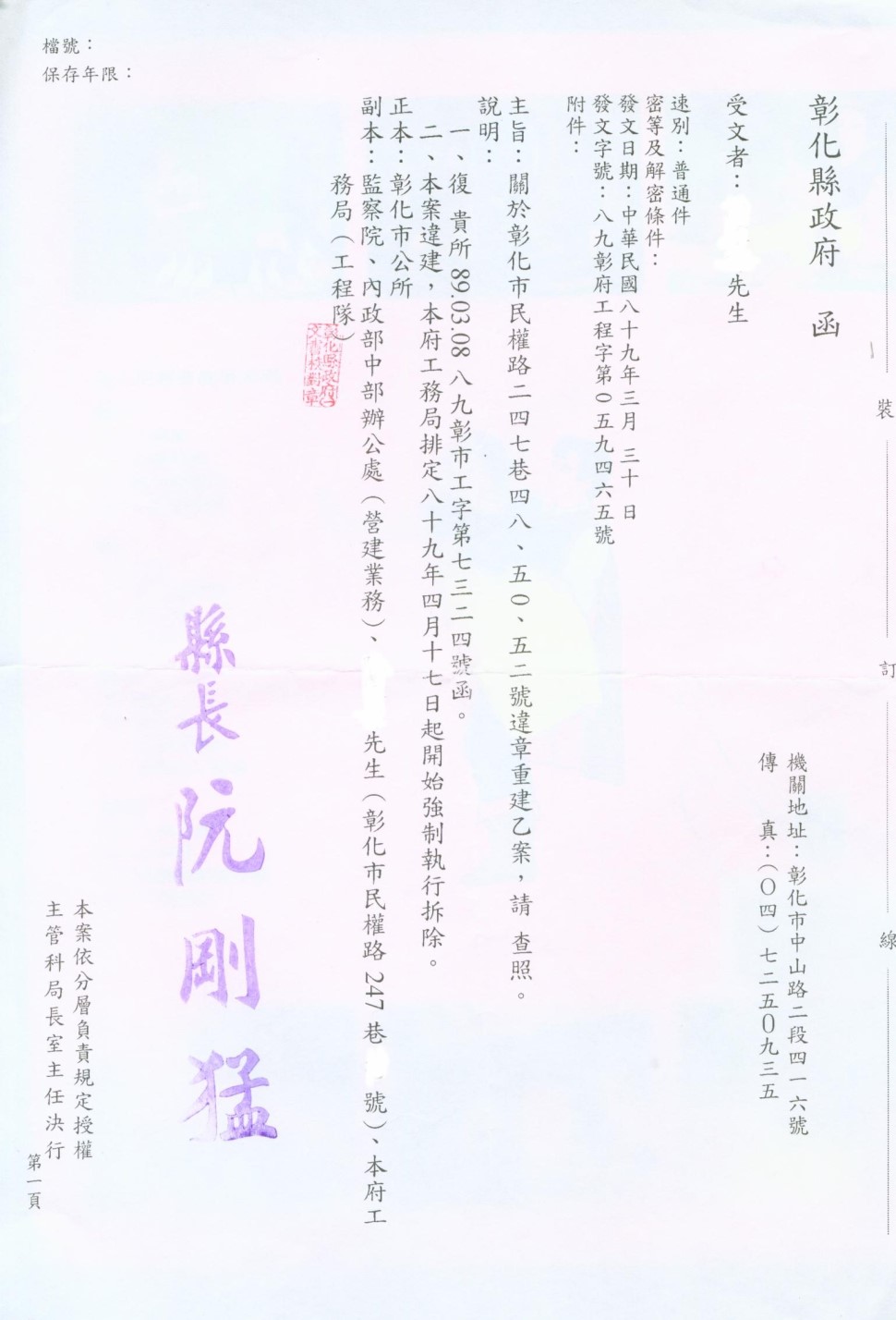 以下公文只說明在同一時間整排違建認定案例,最後選擇性拆三戶(掀屋頂照像,目前屋頂蓋上,如同往常),最後又沒拆成功